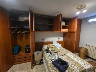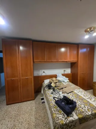 Conjunto de muebles para dormitorio que incluye una cama y un armario empotrado. - Armario con puertas abatibles y estantes. - Cama con cabecero. - Cestas de mimbre incluidas.