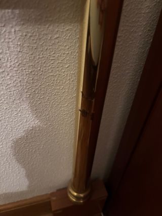 Elegante cabecero de hierro macizo latón forjado con un diseño clásico y detalles dorados. - Estructura principal en hierro gris - Adornos decorativos en latón Dos barras a los lados pero no encuentro los tornillos.