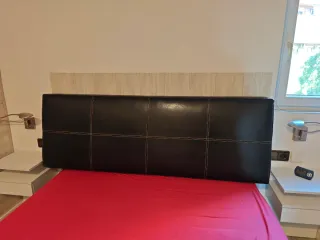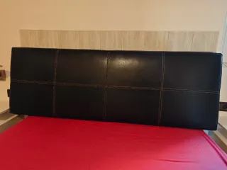 SOLO HOY Cabecero para cama de matrimonio. - Revestimiento en polipiel. - Diseño moderno y elegante. - tiene marcas de uso donde rozaba el colchón, imagino que con el producto adecuado se pueden limpiar/blanquear. Medidas: 150cm ancho 82cm alto 8 cm profundo