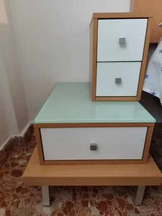 2Mesitas de noche de 55x40x60 cajón liso con pata chependal acabado en blanco. Regalo: Cabecero en polipiel de 142 por 168 de ancho en color maquillaje. Sinfonier 80x40x114, con seis cajones lisos y patas chependal acabado en blanco. Tiradores de Swarosky Factura real 1500 euros