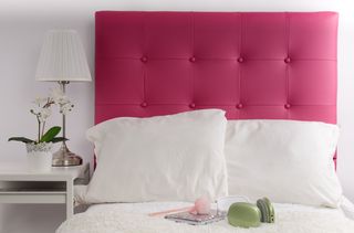 Cabecero para cama individual de 90cm. - Diseño capitoné con botones. - Acabado en polipiel. - Color fucsia vibrante. - Hecho a mano. - Completamente nuevo, a estrenar. Se utilizó únicamente para hacer las fotos de la página web de mueblestapizadoscortes.es (ahí se puede ver que su precio original es muy superior a este)