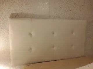 Cabecero de cama,para reparar,está nuevo ,sin utilizar pero sufrió un golpe en el transporte,se ve en las fotos claramente,su precio en tienda es 145,color champan,mide 1,60 de ancho ,viene con patas y se puede anclar a la pared,solo entrega en mano