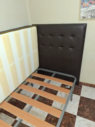 Se vende conjunto de somier, colchón y cabecero. - Cabecero tapizado en polipiel. - Colchón con tejido anti-stress, viscoelástico . (1'50x 1'90) - Somier con patas.