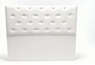 Cabecero de polipiel blanco con un diseño elegante y moderno. Añade un toque de brillo a tu dormitorio. - Acabado en polipiel blanco. - Decorado con incrustaciones tipo diamante. - Diseño capitoné. -medida 135*60 Disponible tambien en 150*60