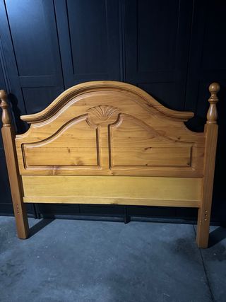 Conjunto de cabecero y pie de cama de madera con un diseño curvo y detalles tallados. - Piezas de madera maciza. - Acabado natural. - Estilo provenzal - Color madera provenzal Medidas: cabecero: 112cm ancho x 115cm alto x 5cm profundidad. Pie: 112cm ancho x 80cm x 5cm profundidad.
