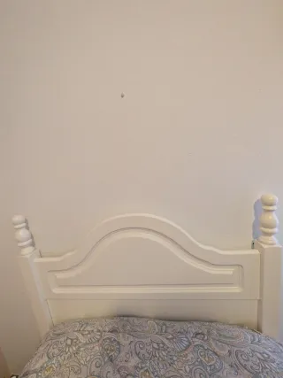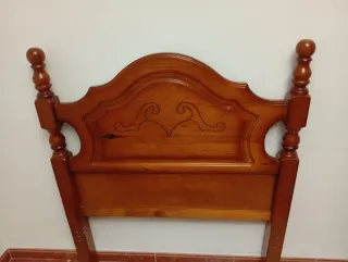 Se vende cabecero de cama de madera estilo provenzal junto con un somier. - Cabecero con diseño curvo y detalles tallados. - Somier de láminas para colchón de 90cm.
