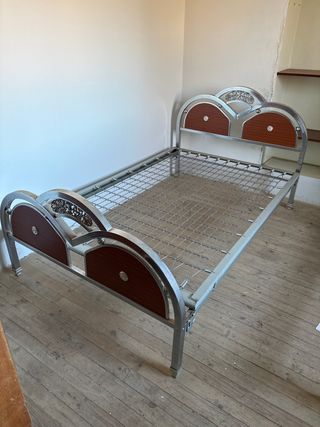Estructura de cama con un diseño vintage y elegante. - Marco principal de metal plateado. - Paneles decorativos en los cabeceros con acabado en madera. - Base de rejilla metálica para el colchón.