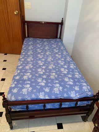 Conjunto de cabecero y piecero de madera maciza tallada y rejilla trenzada. Esta barnizado y policromado con detalles en dorado. El cabecero mide 150 de ancho en la parte inferior y 160 en la parte superior mas ancha x 120 cm de altura. El piecero tambien es de madera y mide 150 x 43 cm de altura. Estan incluidos los travesaños laterales con sus tornillos y dos tablones perperdiculares para colocar sobre ellos una tabla tapizada o somier de lamas y encima el colchon de 150 x 190 cm de largo. No incluye el colchon. En perfectas condiciones como se ve en las fotos.!