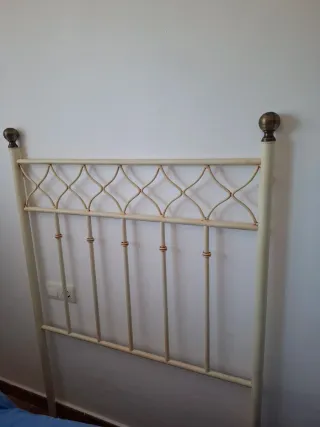 Cabecero metálico de cama de 98cm de ancho, acabado en color blanco roto. En muy buen estado. Preparado para colgar en alcayata en pared.