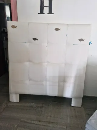 Cabecero de cama con un diseño moderno y elegante. Aporta un toque de estilo a tu dormitorio. - Tapizado en tela y polipiel. - Color beige y blanco. Armario nuevo de Ikea. Vitrina y espejo pintado en blanco. Muy buen estado. Televisor en perfecto estado