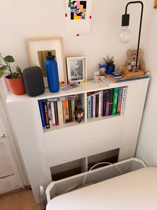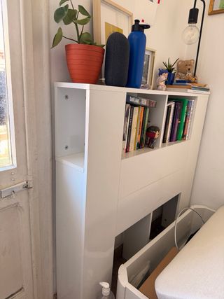 Cabecero con un diseño moderno y funcional y con varios compartimentos integrados, perfecto para guardar libros o objetos decorativos. Está en muy buen estado, con alguna pequeña grieta poco visible que no afecta al uso. Es un cabecero muy bonito y práctico, perfecto para añadir almacenamiento cerca de la cama. Recogida en persona
