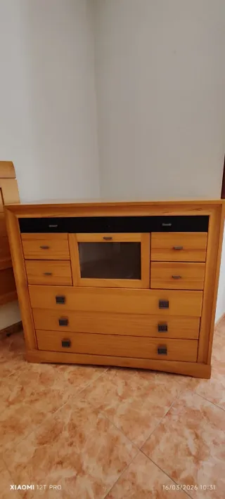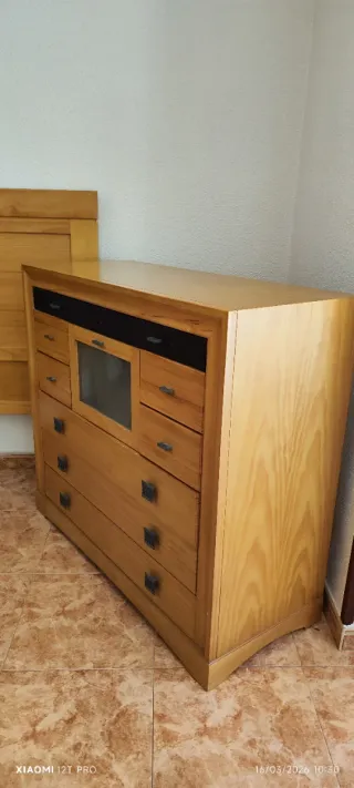 Conjunto de mobiliario de dormitorio compuesto por un cabezal y un sinfonier a juego. - Fabricado en madera.Es importante decir que esto es madera muy resistente,no es aglomerado. - El sinfonier presenta un diseño con varios cajones y un compartimento central con cristal. - Tiradores de diseño. - El cabezal mide 1,47 de ancho de matrimonio vale para cama 1,35 o 1,50. - El sinfonier mide un metro de alto,un metro diez de ancho y 45 centímetros de fondo. Está en un local en Murcia a pie de calle