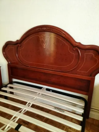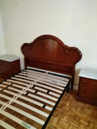 Elegante conjunto de dormitorio con acabados en madera y detalles de mármol. - Cabecero de gran tamaño con diseño curvo. - Dos mesitas de noche con tres cajones cada una. - Estructura de cama a juego. Muebles robustos, cuidados y en buen estado general, con pequeños detalles de uso propios del tiempo. Listos para usar. Ideal para casa, apartamento o casa rural.