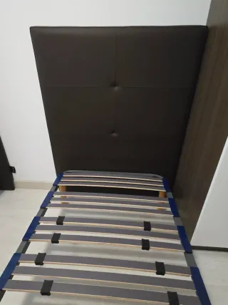 Oferta cama somier + cabecero Cabecero de madera en un color cálido muy bonito. Somier de cama individual de 90 cm: 90 cm ancho, 2.00 cm largo, 37 cm alto. - Estructura de metal, y láminas de madera. - Diseño con cintas de sujeción. Se puede ver sin compromiso en Yamaguchi, san Juan .