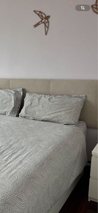 Cama matrimonial con un diseño moderno y acogedor. - Cabecero tapizado en tela. - Incluye dos mesitas de noche a juego. - Colcha con estampado geométrico en tonos azules y grises. Podéis preguntar si os interesa algo por separado: somier, colchon, cabecero,...