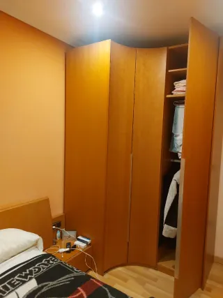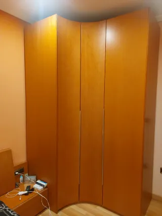 Armario de madera con diseño curvo (esquinero),. Sus puertas presentan un acabado liso y elegante.Cabecero, mesitas y sinfonier. - Material: Madera