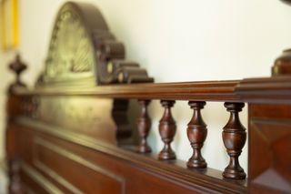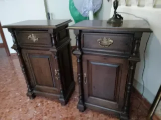 • Cama completa (cabecero y piecero con columnas talladas y coronaciones torneadas). • Dos mesitas de noche a juego, amplias y con detalles torneados. • Armario de 4 cuerpos con gran capacidad, ornamentado con columnas, molduras y remate superior. • Cómoda grande con espejo a juego y tiradores originales en latón trabajado. ✔️ Características destacadas: • Madera noble maciza, robusta y duradera • Tallas artesanales: motivos vegetales, molduras trabajadas, columnas torneadas • Herrajes de calidad en latón labrado • Estilo clásico elegante, ideal para casas grandes, hoteles rurales o aficionados a los muebles tradicionales.