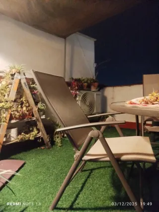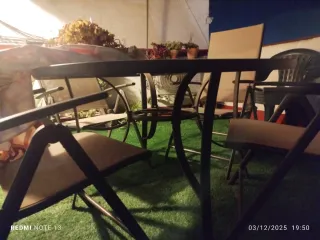 Conjunto de mesa y dos sillas para exterior Estructura metálica - Mesa redonda con cristal - Sillas reclina les con asiento y respaldo de tela.