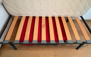 Somier de láminas de madera con estructura metálica. - Láminas de madera. - Estructura metálica. - Base de tela roja. - Apenas se ha usado Medidas: 190cm x 90cm La entrega se hace en Cabrils durante el mes de marzo en fecha por determinar.
