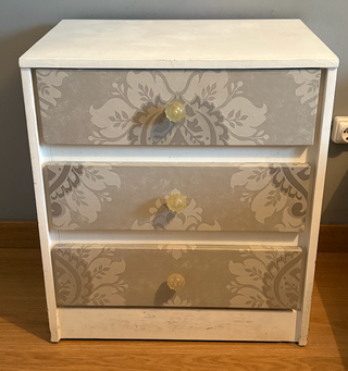 Conjunto de dos mesitas de noche. Precio de 10€ cada una. El papel de flores fue cosa nuestra, puede quitarse y personalizar! - Acabado en blanco con estampado floral (casero). - Tiradores decorativos. - Estructura de madera. - medidas: 55 de ancho, 40 de profundidad y 62 de alto Se puede pintar y empapelar para cambiar la apariencia. Necesitan un lavado de cara. La entrega se hace en Cabrils durante el mes de marzo en fecha por determinar.