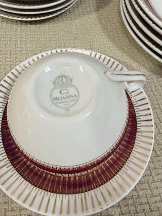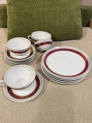 Elegante juego de tazas y platos con un diseño distintivo. - Tazas y platos de porcelana. - 5 tazas, 6 platos pequeños y 5 platos grandes - Detalle de borde en color burdeos y dorado.