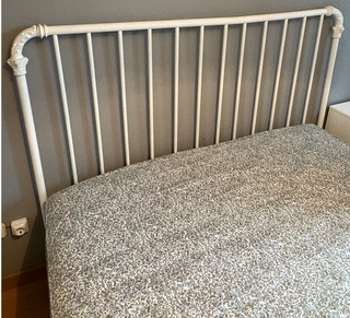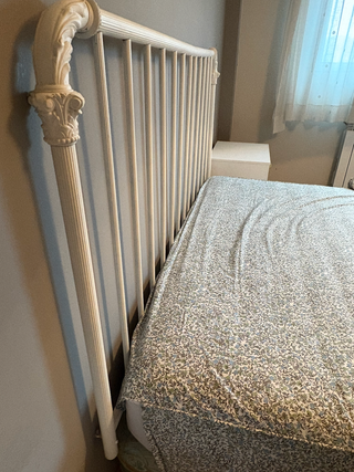 Cabezal de cama de estilo boho chic - Estructura de metal resistente. - Acabado en color blanco. - Detalles ornamentales en los postes. - Medidas: 166 x 90cm La entrega se hace en Cabrils durante el mes de marzo en fecha por determinar.