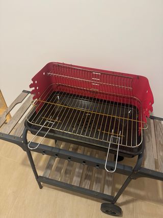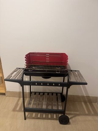 Barbacoa de carbón con estructura metálica y detalles en madera. - Bandeja para carbón. - Rejilla de cocción. - Ruedas para facilitar el transporte. - Tiene meses, ha estado en exterior pero no se ha utilizado. Se puede comprobar en imágenes.