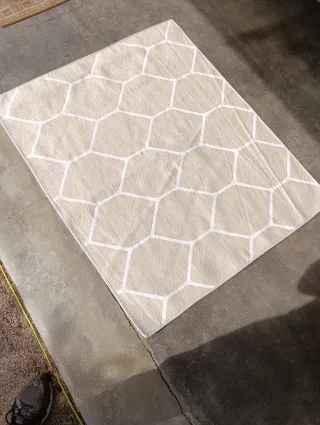 Alfombra con un diseño moderno de hexágonos en color beige y blanco. Cara inferior antideslizante. - Patrón geométrico. - Tonos neutros.