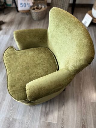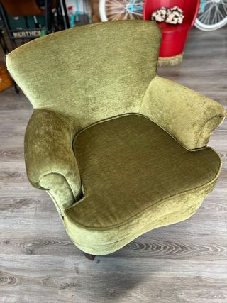 Elegante butaca antigua con un diseño clásico y confortable. Tapizada en un suave terciopelo. - Tapicería de terciopelo. - Color verde oliva.