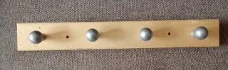 Colgador de pared con cuatro ganchos. Su diseño combina una base de madera clara con cuatro ganchos redondos de metal plateado. 32 cm de largo