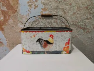 Práctica caja de metal decorada con un gallo y flores.25cm de largo, 15 de ancho, con separadores. 11 de alto - Diseño con separadores interiores. - Asa de madera para facilitar su transporte. - Acabado multicolor con detalles rojos.