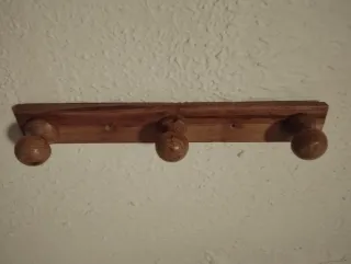 Este perchero de madera oscura es un accesorio práctico para tu hogar. - Diseño de pared. - Incluye ganchos para colgar. - Acabado en tono marrón oscuro. Está bien lo único un pequeño arañazo que se puede pintar y arreglar fácil me te