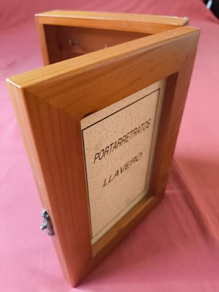 Caja de madera lacada para portarretratos con llavero incorporado con capacidad para 3 llaves. Podrás colgarlo ya que tiene argollas laterales para hacerlo y tener la foto de tu mascota o seres más queridos en el portaretratos. Ideal para casa, garaje, bodega, segunda residencia, jardín, etc Medidas: caja: 15 x 5 x 20 Medidas de retrato foto: 14,50 x 9,50 Artículo nuevo y sin uso alguno. Hago envíos.