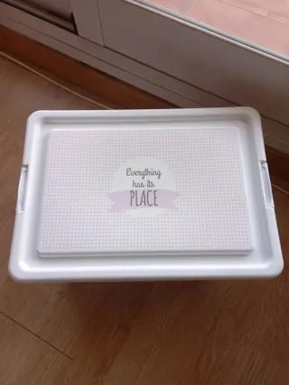 Práctica caja de almacenaje. - Asas laterales para facilitar el transporte. - 34cm Largo / 17,5cm Alto / 23cm Fondo
