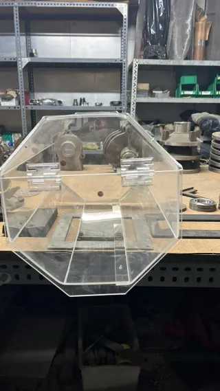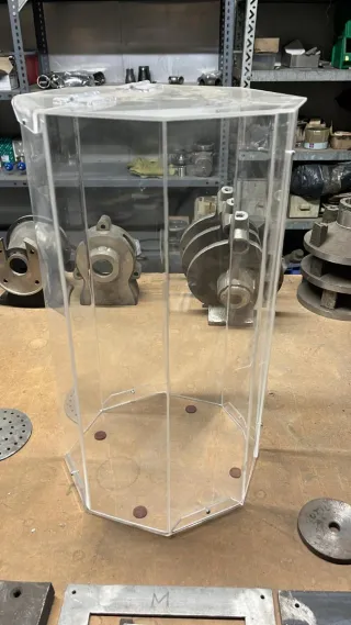 Caja de metacrilato transparente, ideal para exposiciones o almacenamiento. - Diseño octogonal. - Bisagras metálicas para apertura.