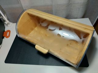 Panera de cocina completamente NUEVA, fabricada en bambú natural con tapa deslizante de plástico translúcido. Ideal para guardar pan, bollería, tostadas o croissants y mantenerlos protegidos del aire y del polvo. ⚠️ Tiene una pequeña grieta en la tapa (se ve en las fotos), pero no afecta para nada al uso. La panera abre y cierra perfectamente y funciona sin ningún problema. Por eso el precio es más bajo. Diseño bonito y práctico para la encimera de la cocina. ____Precio nuevo en tienda 30-35€. panera panera bambu caja para pan panera cocina panera madera panera bambu cocina panera con tapa panera moderna panera encimera caja pan coc