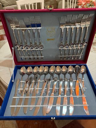 Elegante cuberteria dcon acabado en terciopelo, ideal para coleccionistas o aficionados del FC Barcelona. tambien Vajilla. todo sin usar. - Diseño con el escudo del FCB. - Color rojo intenso. - Material de terciopelo suave al tacto.
