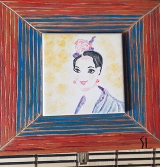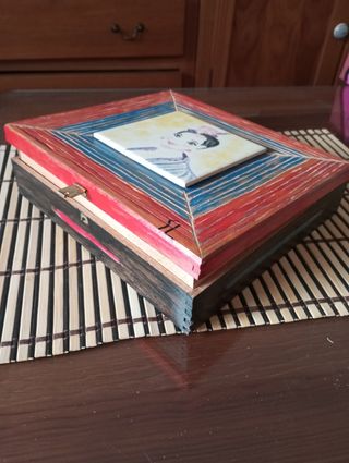 Caja de madera -reutilizada- grabada a mano con buril y pintada,en la tapa lleva un azulejo pintado a mano. Interior forrado con fieltro.