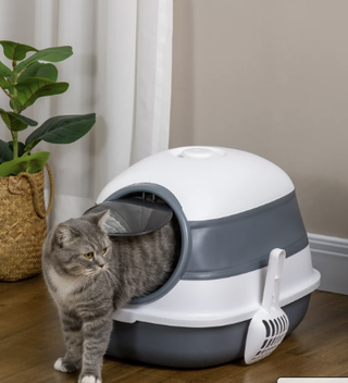 Caja de arena para gatos con diseño cerrado y plegable. Fabricada en plástico resistente y fácil de limpiar. - Color blanco y gris. - Entrada circular. - Pala incluida. D31-066V00WT zona f1