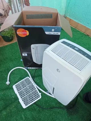 Deshumidificador de la marca Equation en color blanco. Incluye su caja original y accesorios. - Capacidad de 30L/24h. - Cobertura para hasta 40m². - Manguera para drenaje continuo.