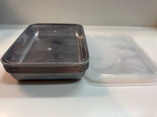 Set de siete recipientes de acero inoxidable con tapas transparentes. 7 recipientes de acero inoxidable para almacenar alimentos, ideales para la preparación de comidas, acampadas al aire libre y como cajas para conservar alimentos. - Fabricados en metal y plástico. - Diseño plateado y transparente.