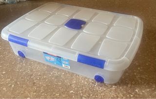Práctica caja de almacenaje para poner debajo de la cama o en trastero. - Diseño transparente para fácil identificación del contenido. - Fabricada en plástico resistente.