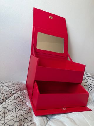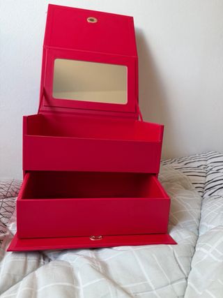 Práctica caja para almacenar tus objetos personales. Cuenta con un espejo integrado en la tapa. - Diseño de dos niveles con bastante espacio. - ideal para guardar, maquillaje, productos de higiene, entre otros. - Cierre de botón a presión.