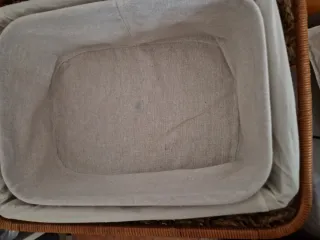 Conjunto de cestas decorativas con un diseño atractivo. - Cestas de mimbre con forro interior de tela. - Combinación de colores naturales y beige. Medidas: 58X48X16 vendido 44X32X16 36X26X12 Vendidos separados