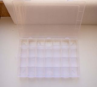 aja de plástico con 28 compartimentos para guardar minerales, bisutería, piezas de ferretería... Mide 34,5 cm de ancho, 22 de profundidad y 5 de alto. Dispongo de varias cajas iguales. Cada uno de los 28 compartimentos es un rectangulo de 5,5 x 5cm. Los compartimentos se pueden unir quitando separadores cuadrados de plástico (como se aprecia en alguna de las fotos)