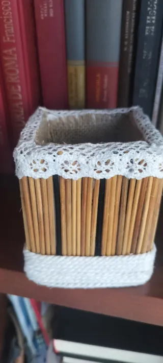 Bonita caja hecha a mano, perfecta para organizar pequeños objetos. - Diseño con varillas de bambú. - Forro interior de tela. - Adorno de encaje en el borde superior. - Cinta de tela en la base.