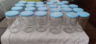 Lote de 35 botes de cristal con tapas azules, ideales para manualidades o para guardar tus elaboraciones caseras o artesanales. - Botes de cristal transparentes. - Tapas de aluminio azules. - Miden 350 ml. - Están limpios por lavavajillas y conservados. - Se pueden dar en mano en Puertollano y alrededores y Ciudad Real capital. - También posibilidad con envíos con la caja con mucha fragilidad y seguridad.