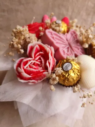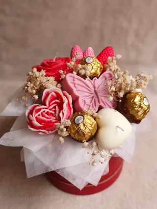 Caja de velas especial San Valentín, con bombones, wax melts, flores secas, y por supuesto velas.