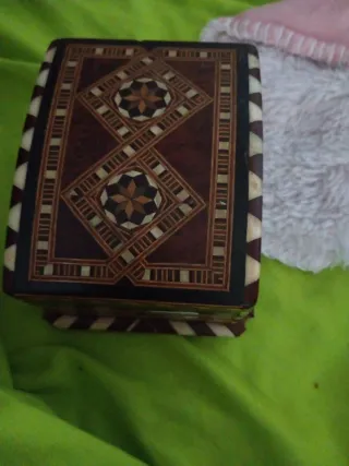 Elegante caja con intrincados detalles de marquetería. - Diseño geométrico con motivos de estrellas. - Bordes con bandas de madera clara y oscura. - Acabado en tonos marrones y multicolores.