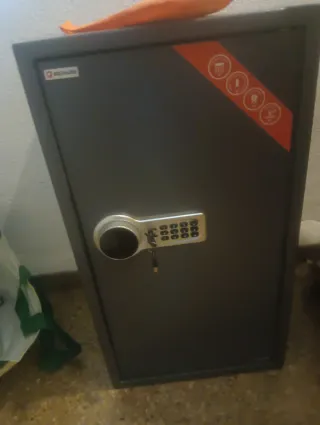 Caja fuerte de gran tamaño, ideal para proteger tus objetos de valor. Cuenta con un sistema de cierre electrónico y llave. - Diseño moderno y robusto. - Panel numérico para combinación. - Incluye llave de emergencia. 150€ no negócio